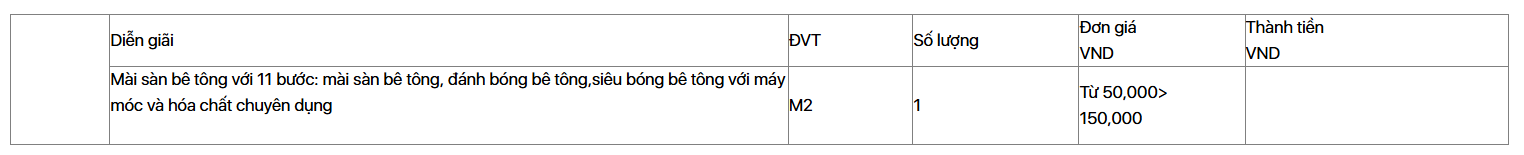 - Phí dịch vụ Báo giá đánh bóng sàn bê tông (mài sàn và đánh bóng sàn bê tông) theo dự toán: